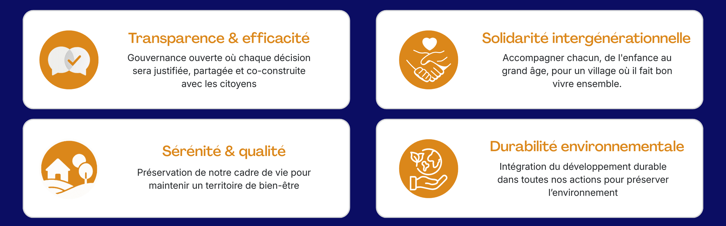 Un programme transparent, ambitieux et réaliste, fondé sur nos valeurs de proximité, d’écoute et de co-construction.